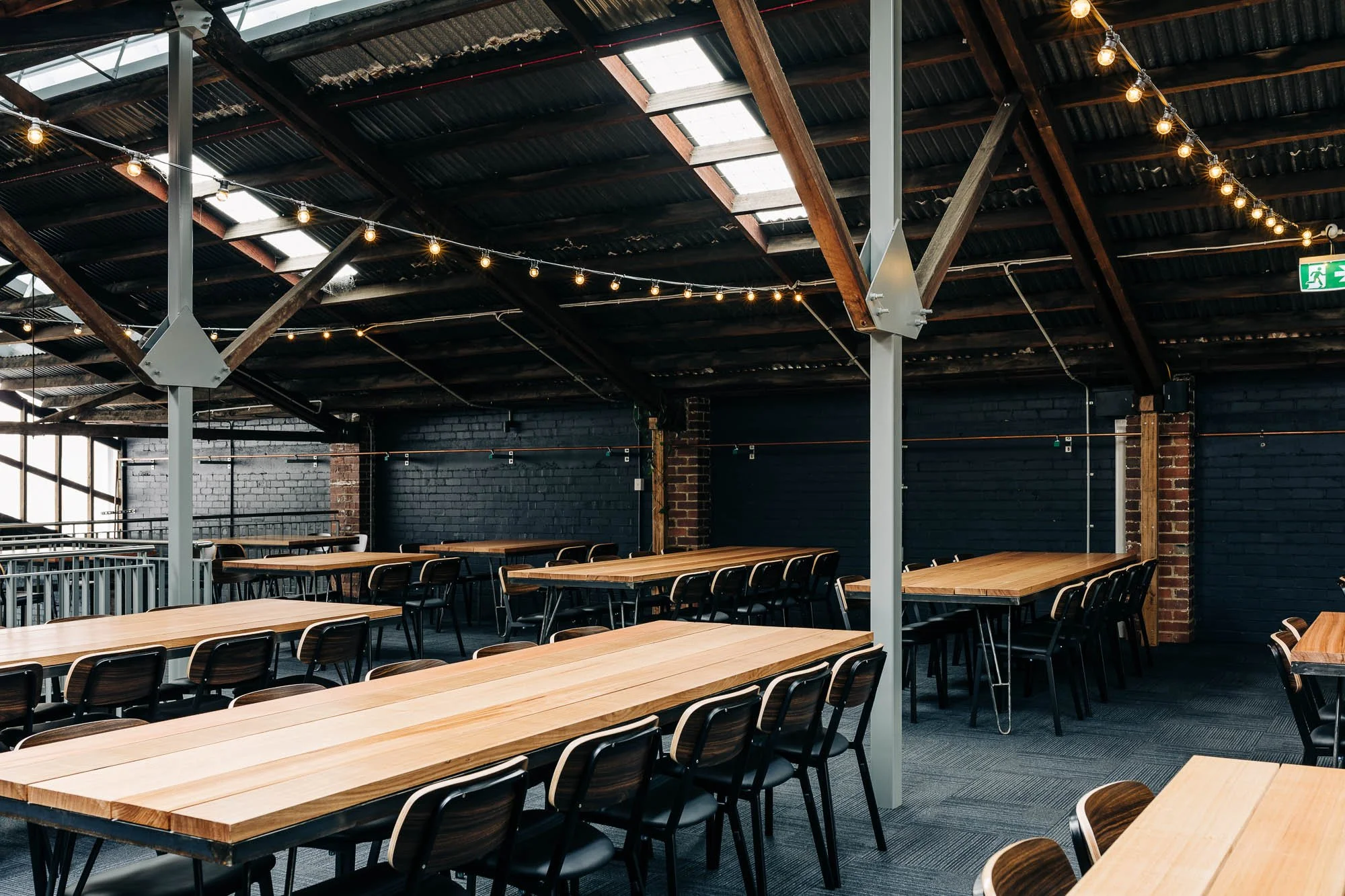 The downstairs area is a swathe of concrete floors, a private dining room, a pool table and a sneak peek of the brewery down the back. The upstairs mezzanine dining area is a moody but warm space, lit with festoon lighting, and long share tables, accomodating both small and large groups. An ideal function space for weddings, parties and events.